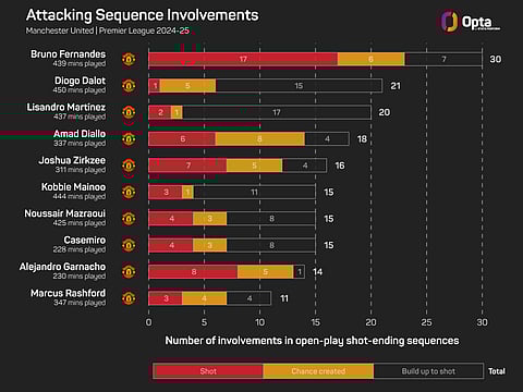 The Portugal international has, however, been involved in at least nine more attacking sequences (30 – 17 shots, six chances created, seven build-ups to a shot) than any of his team-mates this term (Diogo Dalot is second with 21).