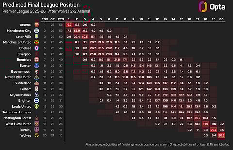 The Opta supercomputer still makes Arsenal favourites to win the title, with a 79.7% probability, but that figure stood at 85.1% before the Wolves game.