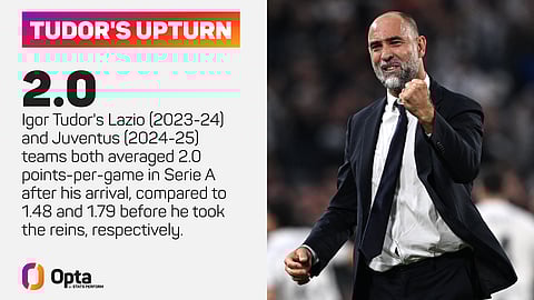 Udinese went from 0.97 to 1.75 in 2017-18, then 0.93 to 1.64 when he returned in 2018-19. Verona were pointless when he took over in 2021-22 and picked up 1.51 points per game under him. And both Lazio (2023-24) and Juventus (2024-25) averaged exactly two points per game with Tudor in charge, having averaged 1.48 and 1.79 before him.