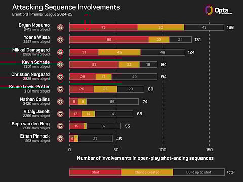 The 25-year-old was involved in 166 open-play shot-ending sequences in the league, leading Brentford's squad.