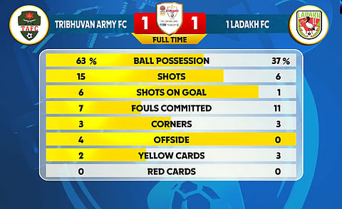 The scoreline stays at 1-1 after five minutes of added time, and the Himalayan Derby thus ends in a stalemate. Ladakh get a draw on debut, while Tribhuvan Army will now find it hard to advance from Group C, having lost their opener to NorthEast United.