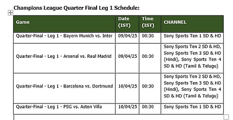 Language feeds of the Arsenal vs. Real Madrid match and Barcelona Vs. Dortmund fixture will be available on Sony Sports Ten 3 SD and HD (Hindi); Sony Sports Ten 4 SD and HD (Tamil and Telugu) on April 9 and 10,2025 respectively from 12:30 AM IST onward.