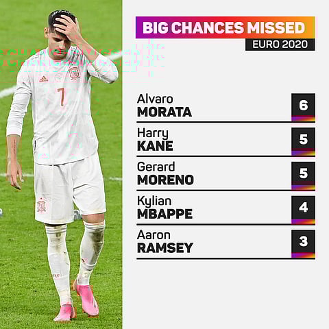 At Euro 2020, only Alvaro Morata (six), Gerard Moreno and Kane (five each) missed more big chances (as defined by Opta) than Mbappe (four). His 14 total shots amounted to 1.7 expected goals (xG), with only Moreno (-2.25) and Dani Olmo (-1.86) underperforming their xG figures by a greater margin.