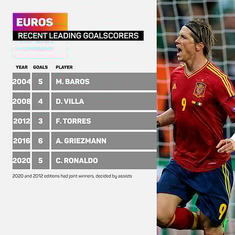 Since the Euros expanded to 16 teams for 1996, the fewest goals needed to win the Golden Boot was three, with Torres taking the honours in 2012, after his team-mate David Villa did so with four in 2008.