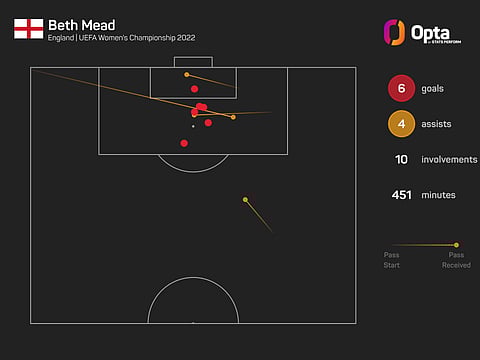 Mead also holds the record (since 2013, from when Opta have such data on record) for most assists at a single edition of the Euros, having provided four assists in 2022. She finished the tournament with 10 goal involvements.