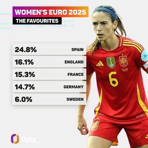 While England are not favourites, they are given a 16.1% chance of retaining their crown and are expected to face Spain in another major final, with the Opta prediction model rating their likelihood of making the showpiece in Basel at 28.2%.