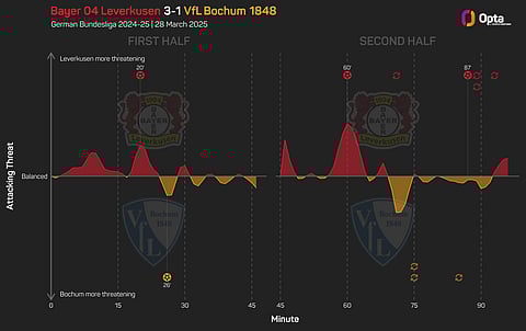 There was little to split the sides in the first half, but Leverkusen found their foothold in the second, having nine attempts worth 1.78 expected goals (xG).