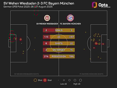 Bayern also racked up 3.87 expected goals (xG) to Wiesbaden's 1.13, their most in a DFL-Pokal match since they thrashed fifth-tier Bremer SV 12-0 in the first round of the 2021-22 tournament under Julian Nagelsmann (5.86 xG).