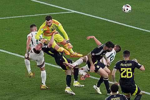 Hungary's Barnabas Varga (19) collides with Scotland's goalkeeper Angus Gunn, top left, during a Group A match between Scotland and Hungary at the Euro 2024 soccer tournament in Stuttgart, Germany.