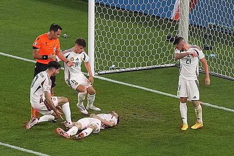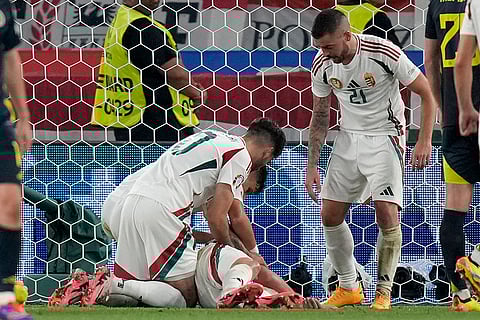 Hungary's Barnabas Varga (19) is attended after an injury during a Group A match between Scotland and Hungary at the Euro 2024 soccer tournament in Stuttgart, Germany.