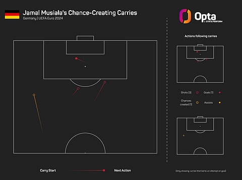 One of just six players with multiple goals to his name at this stage, Musiala has also completed the second-most dribbles at the tournament with nine, behind only Belgium's Jeremy Doku (13).