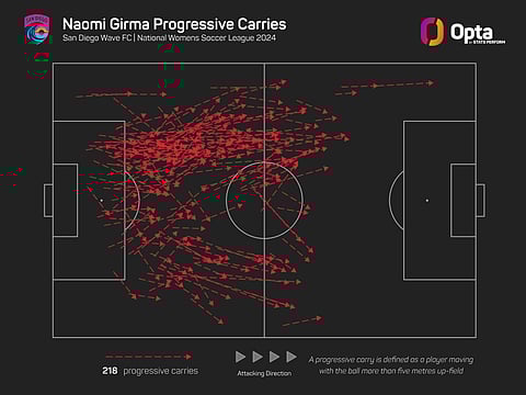From her NWSL debut in May 2022 until the end of the 2024 season, Girma won the most possession in the defensive third (304), and made the joint-most progressive ball carries (548).