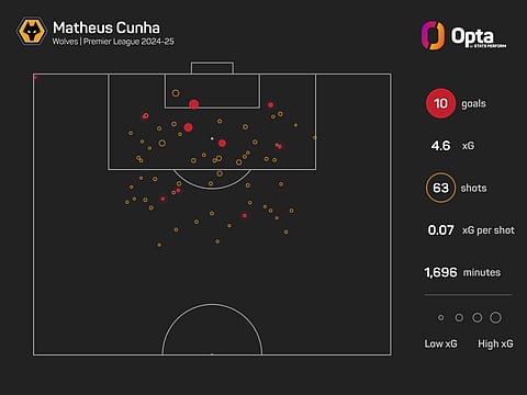 Cunha's expected goals (xG) overperformance of +5.47 this season (10 goals from 4.63 xG) is the third-best in the league, behind Bryan Mbeumo (13 goals, 6.8 xG) and Chris Wood (14 goals, 8.08 xG).