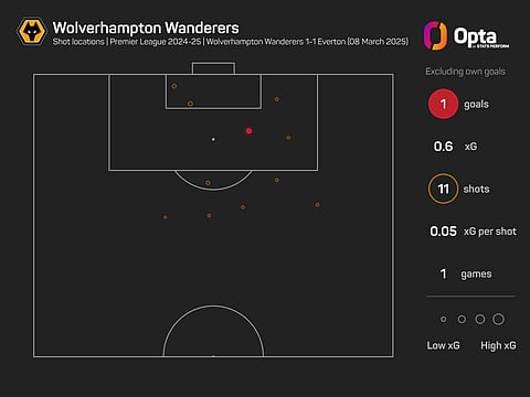 Wolves had a 70.2% possession share after half-time and played 99 passes in the final third to Everton's 44, but they only generated chances worth 0.13 expected goals (xG) to their opponents' 0.42.