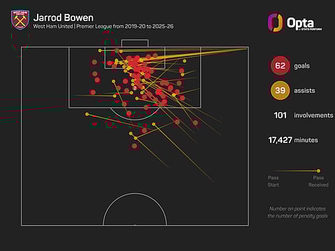 With his goal against Brighton, Bowen equalled Michail Antonio for the most combined goals and assists recorded for West Ham in the Premier League (101 each).