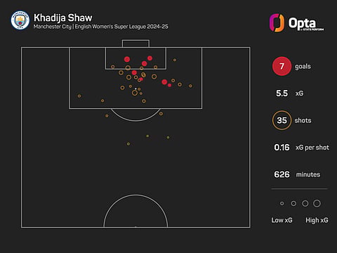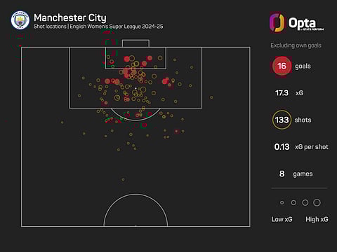 Man City have the highest xG (17.3) in the WSL, though they have slightly underperformed, netting 16 times from 133 shots. A failure to match Chelsea's ruthlessness in front of goal cost them the title last season, and they are also behind the Blues' pace this term.