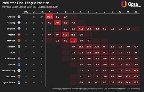 Chelsea were tipped for WSL glory at the start of the season and are now even bigger favourites to win the title according to the Opta supercomputer, which hands them a massive 93% chance of retaining the crown. That is up from 59% at the start of the season.