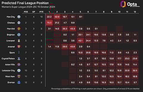 Opta's supercomputer made third place the most likely position for Arsenal (37%) prior to the campaign. The model now forecasts Arsenal to finish fourth, with a 43.8% chance of doing so – it gives them an 11.9% chance of finishing second, while the likelihood of them coming third is still a relatively high 34.5%.