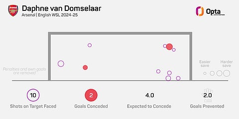 D'Angelo, who has only played four WSL matches since the start of last season, has helped the Gunners keep two clean sheets, but in those two other games, she conceded three times (excluding own goals) from an xGoT conceded of 2.76.