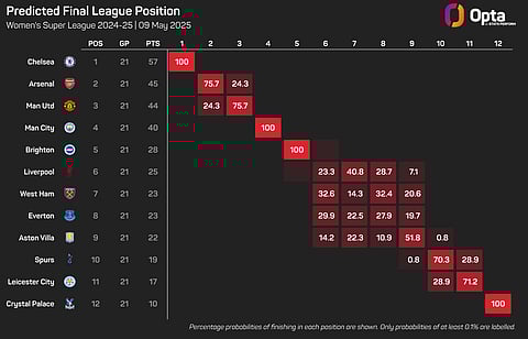 The Opta supercomputer is backing Arsenal to finish as runners-up, with Renee Slegers' side having a 53.5% chance of victory and a 23.9% likelihood of earning a draw, as they continue to build towards their Champions League final date with Barcelona.