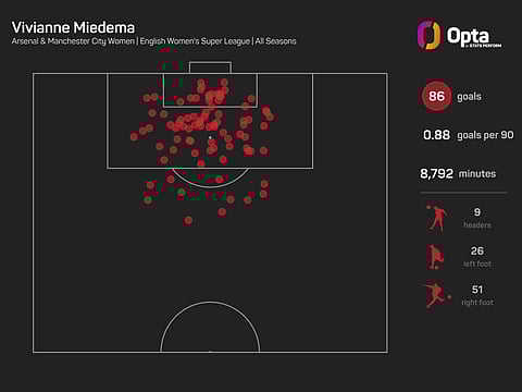 As well as being the league's all-time top scorer, Miedema also leads the WSL for goal contributions, with 122 following her assist for Khadija Shaw on Wednesday against West Ham.