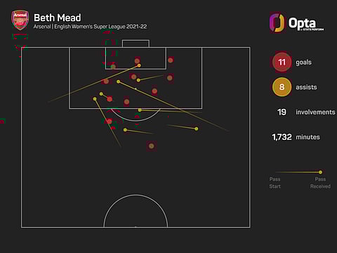 In that title-winning campaign, Mead managed 19 goal involvements (seven goals, 12 assists), while her second-best season came ahead of the Euros in 2021-22, when, again, she registered 19 (11 goals, eight assists).