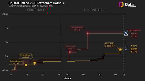 Meanwhile, at the VBS Community Stadium, Olivia Holdt came off the bench to net a 95th-minute free-kick to earn Tottenham a 3-2 victory over London rivals Crystal Palace.