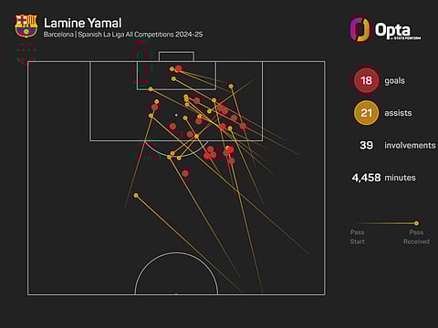 Remarkably, Yamal led the charts in LaLiga for assists (13), shots from outside the area (67), big chances created (28), shots following a carry (56), chances created following a carry (35), throughballs (33) and dribbles completed (161) in 2024-25.