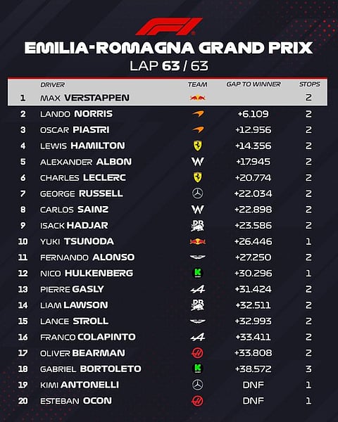 Top performance from Max Verstappen and he manages a fourth straight victory at Imola. Oscar Piastri, who started from pole, had a bit of up and down before he settled at the second spot. his McLaren teammate Lando Norris completed the podium. It was a good finish for Lewis Hamilton as well who finished at the fourth spot. Williams' Alexander Albon got the fifth place.