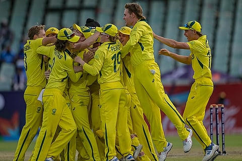 Australia celebrates winning the match and the ICC U19 men's Cricket World Cup Final between India and Australia, in Benoni, South Africa.
