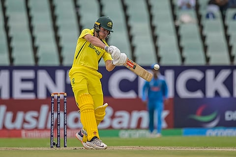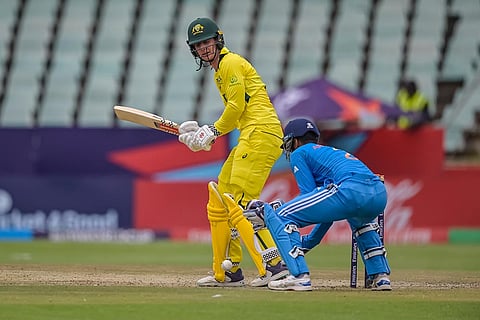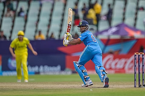 India U19's Musheer Naushad Khan plays a ball during the ICC U19 men's Cricket World Cup Final between India and Australia, in Benoni, South Africa.