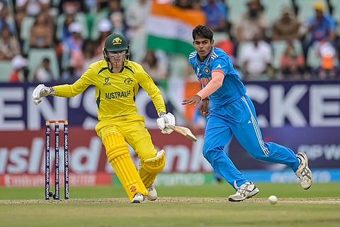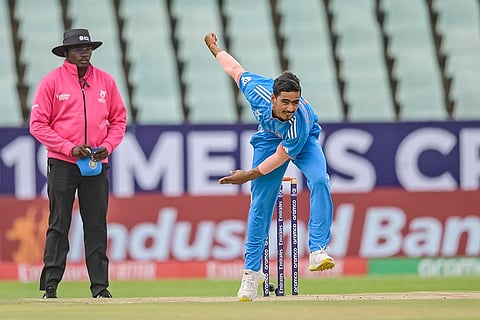 India U/19's Naman Tiwari bowling a ball during the ICC U/19 men's Cricket World Cup Final between India and Australia, in Benoni, South Africa.