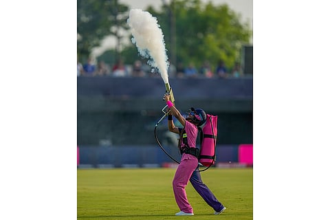 A performer fires a smoke gun during the opening ceremony ahead of the men's T20 World Cup cricket match between the United States and Canada at Grand Prairie Stadium, in Grand Prairie, Texas.