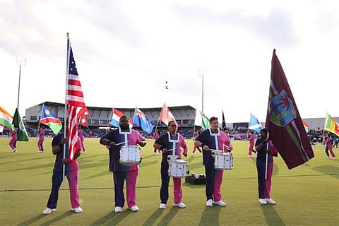 Drummers and flag-bearers at the American leg of the ICC T20 World Cup 2024 opening ceremony, at the Grand Prairie Cricket Stadium in Dallas, Texas.