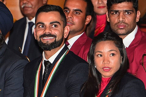 Recipients of Rajiv Gandhi Khel Ratna cricketer Virat Kohli and weightlifter Mirabai Chanu at the National Sports and Adventure Award 2018 function where the cricketer was conferred Rajiv Gandhi Khel Ratna at the Rashtrapati Bhawan in New Delhi on September 25, 2018. PTI Photo/Shahbaz Khan