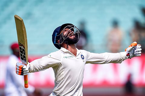 Ravindra Jadeja celebrates his century during the first Test match played between India and West Indies in Rajkot on October 5, 2018. PTI Photo/Shashank Parade