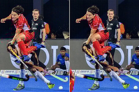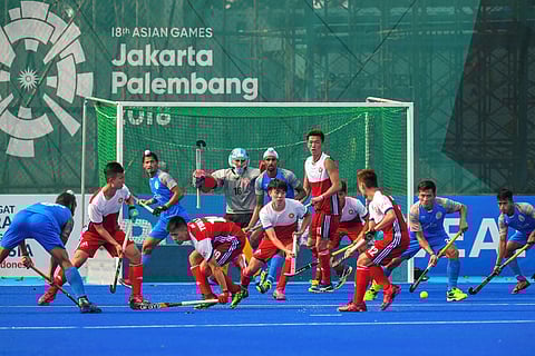 Indian and Hong Kong players in action in the men's hockey pool match at the Asian Games
