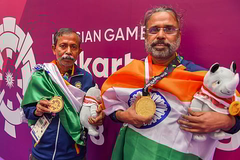 Gold medallist Pranab Bardhan and Shibhnath Sarkar pose with the Indian Tricolour after winning in bridge competition at the 18th Asian Games in Jakarta on September 1, 2018. PTI Photo/Shahbaz Khan