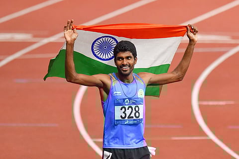 Jinson Johnson celebrates with the Tricolor after winning gold in Men's 1500m event at the 18th Asian Games in Jakarta, Indonesia on August 30, 2018. PTI Photo/Shahbaz Khan
