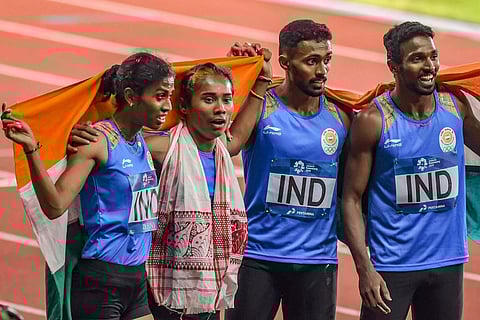 4x400m mixed relay team celebrates after winning the silver medal during the athletics competition at the 18th Asian Games in Jakarta, Indonesia on August 28, 2018. PTI Photo/Vijay Verma