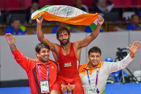 Bajrang Punia carries the Tricolour after winning in the final of men's freestyle wrestling (65kg) against Japan's Daichi Takatani at the Asian Games 2018 in Jakarta on August 19, 2018. PTI Photo/Shahbaz Khan