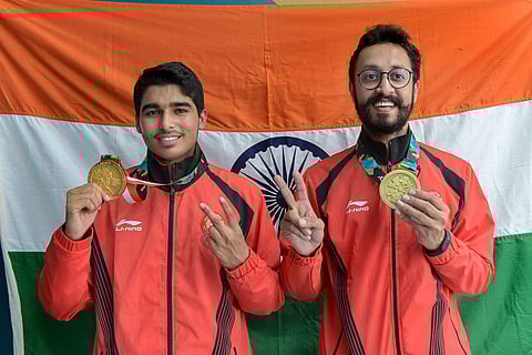 Shooters, gold medal winner Saurav Chaudhary and bronze medallist Abhishek Verma (R) pose for photographs during the medal presentation ceremony of men's 10m air pistol event at the 18th Asian Games 2018 at Palembang in Indonesia on August 21, 2018. PTI Photo/Vijay Verma