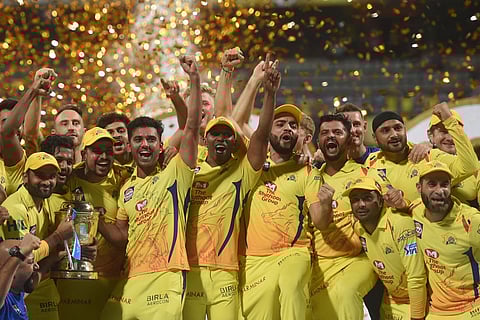 Chennai Super Kings players celebrate with the IPL 2018 trophy after winning the final match against Sunrisers Hyderabad in Mumbai on May 27, 2018. CSK defeated SRH by eight wickets to lift the trophy. PTI Photo/Shashank Parade