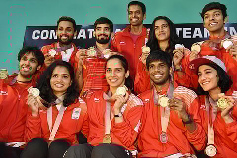 Shuttlers Saina Nehwal, Kidambi Srikanth, PV Sindhu and others show their Commonwealth Games medals at a press conference in Hyderabad on April 17, 2018. Coach P Gopichand is also seen. PTI Photo