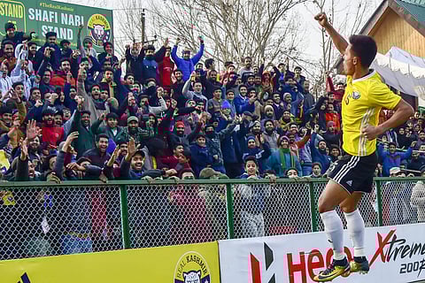 Real Kashmir FC player Surchandra celebrates after scoring a goal against Shillong Lajong FC during their I-League football match in Srinagar on December 11, 2018. Real Kashmir FC won by 6-1. PTI Photo/S Irfan