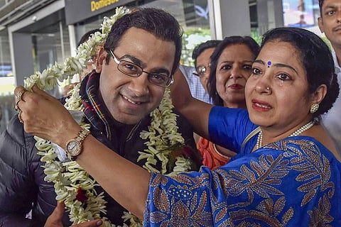 World Billiards Champion Sourav Kothari being welcomed by his mother on his arrival at NSCBI Airport in Kolkata on November 1, 2018. PTI Photo/Ashok Bhaumik