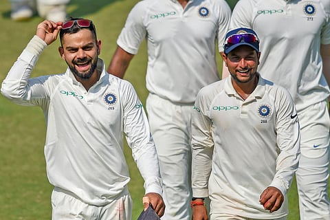 Virat Kohli and Kuldeep Yadav celebrate their victory in the first Test match against the West Indies in Rajkot on October 6, 2018. PTI Photo/Shashank Parade