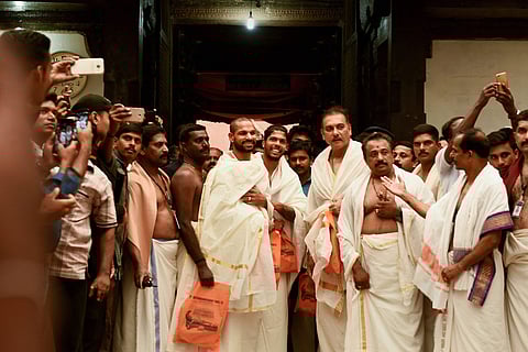 National cricket team head coach Ravi Sashtri with players Shikhar Dhawan and Umesh Yadav during a visit to Shri Padmanabhaswamy Temple ahead of their 5th and final ODI cricket match against the West Indies in Thiruvananthapuram on October 31, 2018. PTI Photo/R Senthil Kumar