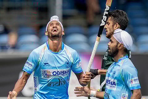 Mandeep Singh celebrates after scoring a goal against Pakistan during a Champions Trophy Hockey 2018 match in Breda, Netherlands on June 23, 2018. India defeated arch-rivals Pakistan 4-0 in the opening match. PTI Photo
