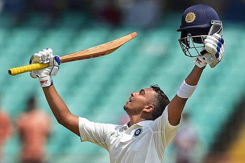 Prithvi Shaw celebrates his century on Day 1 of the 1st Test match against the West Indies in Rajkot on October 4, 2018. Shaw became the youngest Indian cricketer to score a hundred on debut. PTI Photo/Shashank Parade